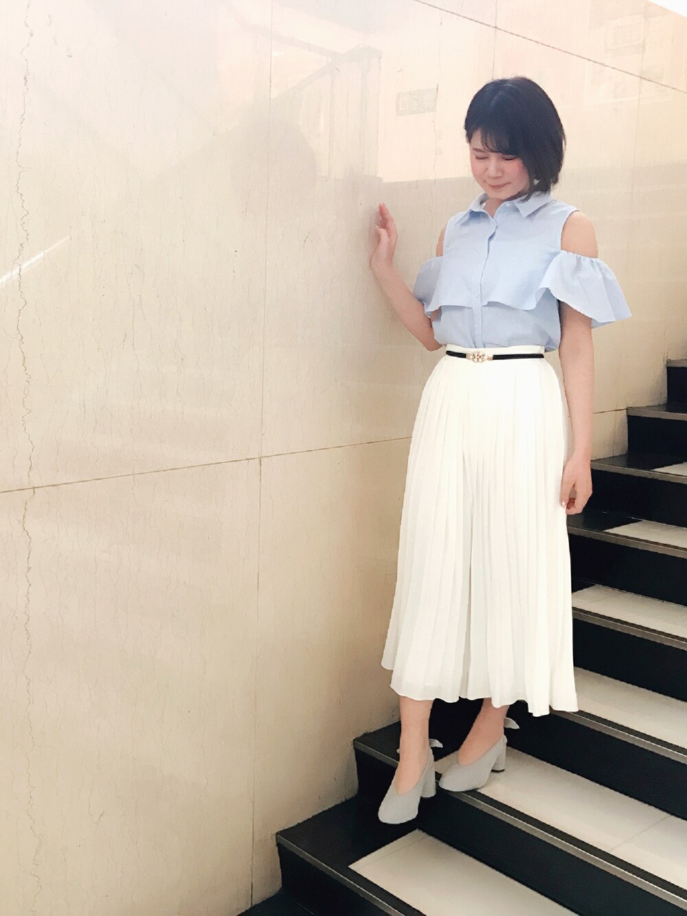 爽やかな印象のキレイめコーデ👠❤️ ウエストのリボンをブラックのベルトに変えて アクセントにしています😆