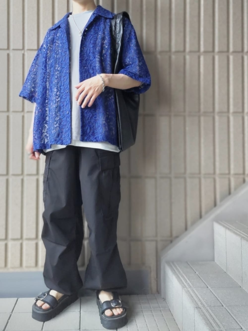 いつもご覧頂きありがとうございます ブルーのレースシャツを使ったコーディネート 色はシンプルにまとめつつアイテムはカジュアルに振って夏らしいきれいめカジュアルスタイルに