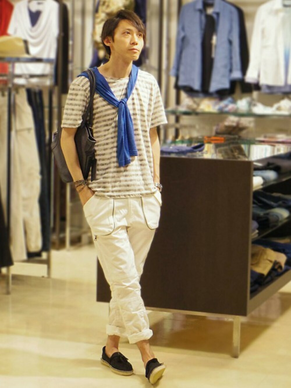 ボーダーのTシャツと白パンツの爽やかコーディネート。 全体の色味を抑えつつも肩からかけたブルーのカーディガンが「こなれ感」を演出。 パンツ丈はロールアップさせ適度にリラックスさせたシルエットもポイントです。