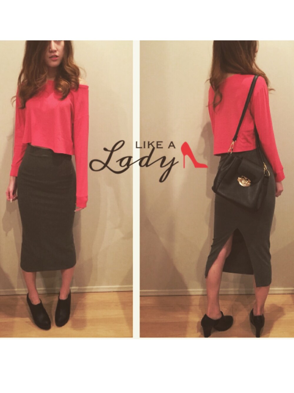 ️❤️ロングスカートの上下セット スリットが入って後ろ姿が綺麗でお気に入り☻ 春も活躍するセットです🎵 モデル:身長169㎝ 着用サイズ:Free size カラー:赤×ダークグレー 価格:¥3,800
