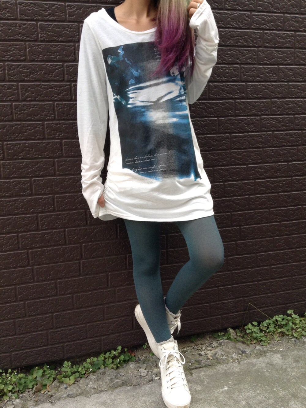 日焼け防止に夏でも時々長袖。 袖口と裾のシャーリングのおかげでただのカットソーをワンピ風にシンプルに着てものっぺりしない優秀さ。 グラフィックのカラーを活かしたコーデ。