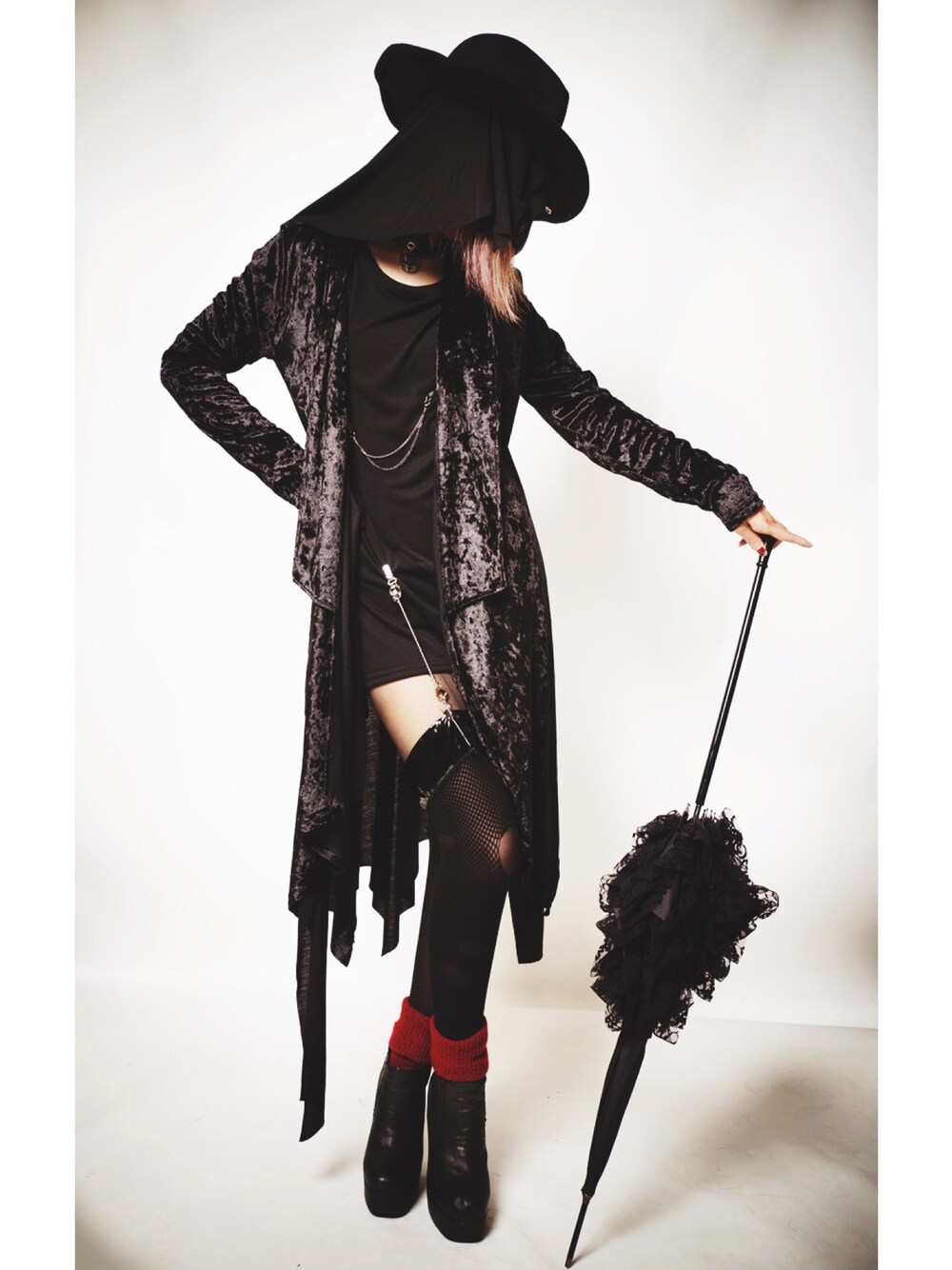 手持ちの服で即席ハロウィンアレンジ。 アシメデザインのドレスカットソーにベロアカーディガンを合わせてゴシックに。 仮装感出すのにエナメル縁の網タイツと、そのへんにあった黒い布(笑 をつば広ハットの間に挟んだだけ!