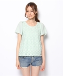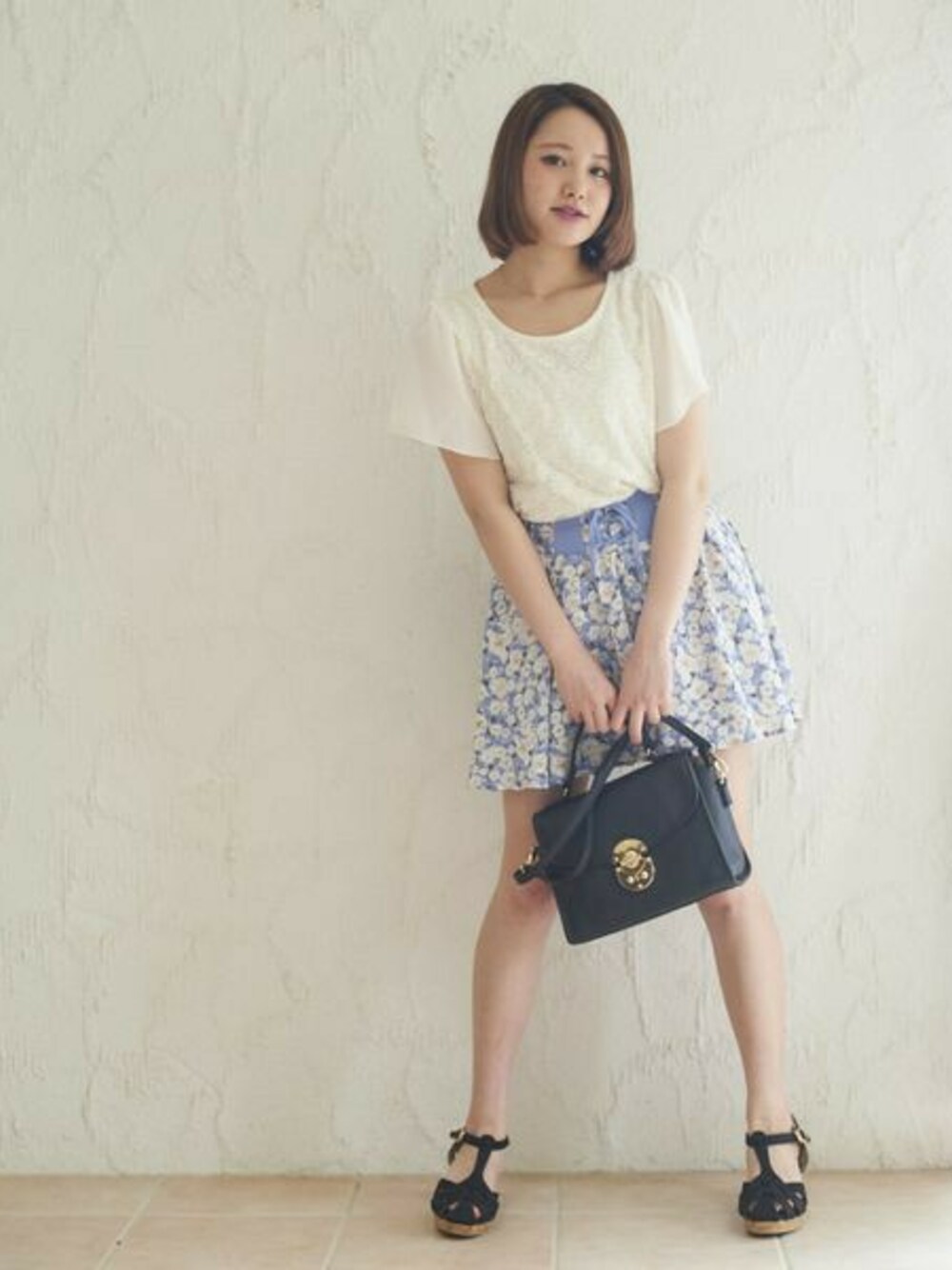 フロントのレースがロマンティックなTシャツに花柄ボトムでフェミニンに♪