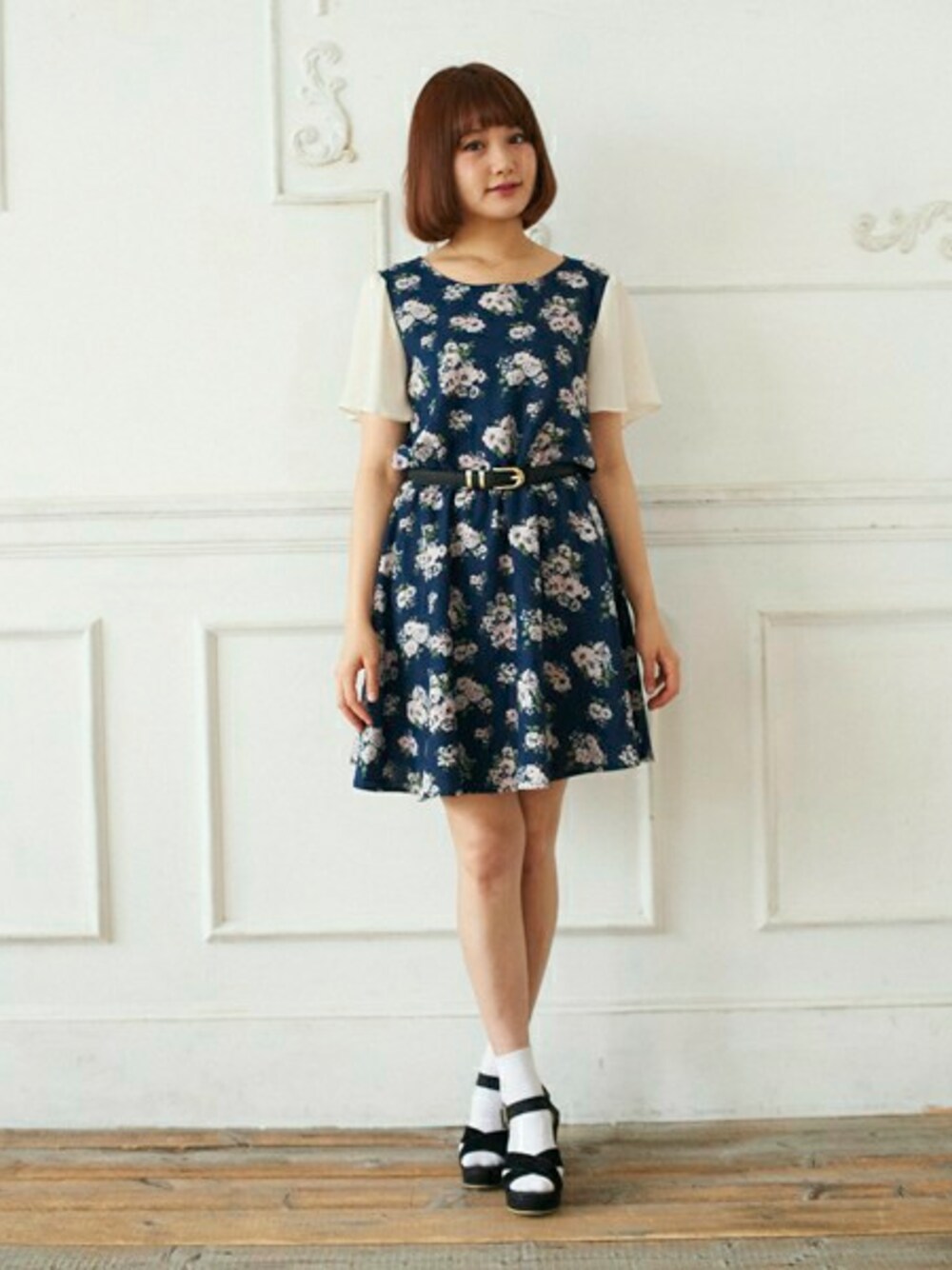 袖を無地生地で切り替えたブーケ花柄のワンピース♪ベルトでウエストマークし、1枚でバッチリです★