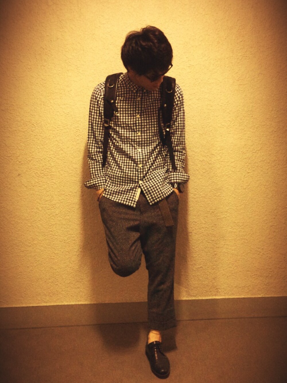 通りすがりに、まいさんとゆうお方の、 まいフェス2に参加させて頂きます\(^o^)/ まいさんはいつもこっそり見ております\(^o^)/ グレー×チェケラーとゆう事で、おじさん風味の グレーのクロップドパンツに、おじさん風味の革靴。 そして、ギンガム\(^o^)/ 結果、全体的におじさん風味です\(^o^)/
