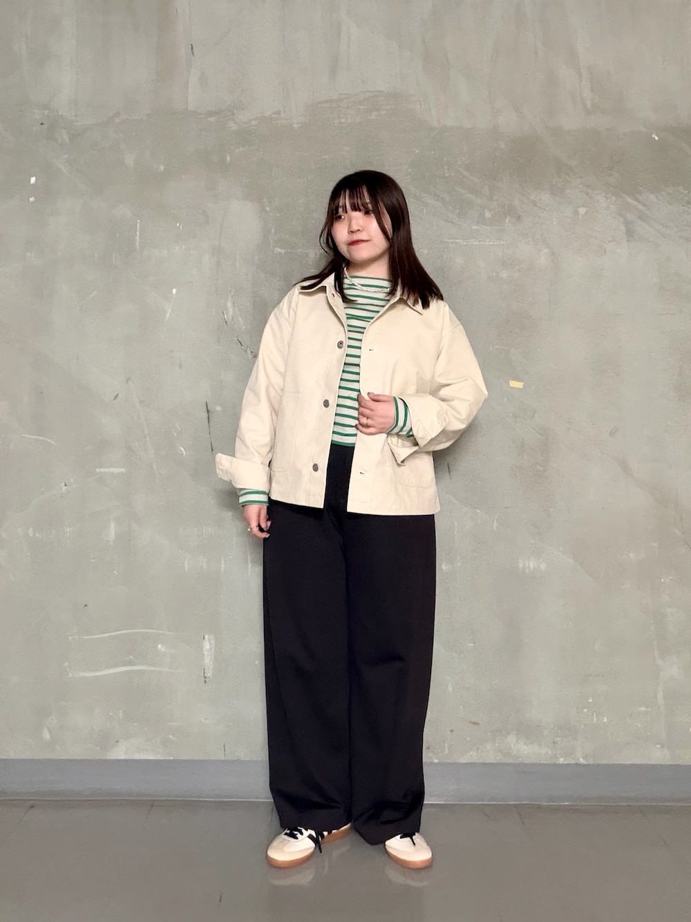 カジュアルなカバーオールにグリーンを効かせたコーデ🎵 ホワイト×グリーンの組み合わせで春らしい印象にしました🌷
