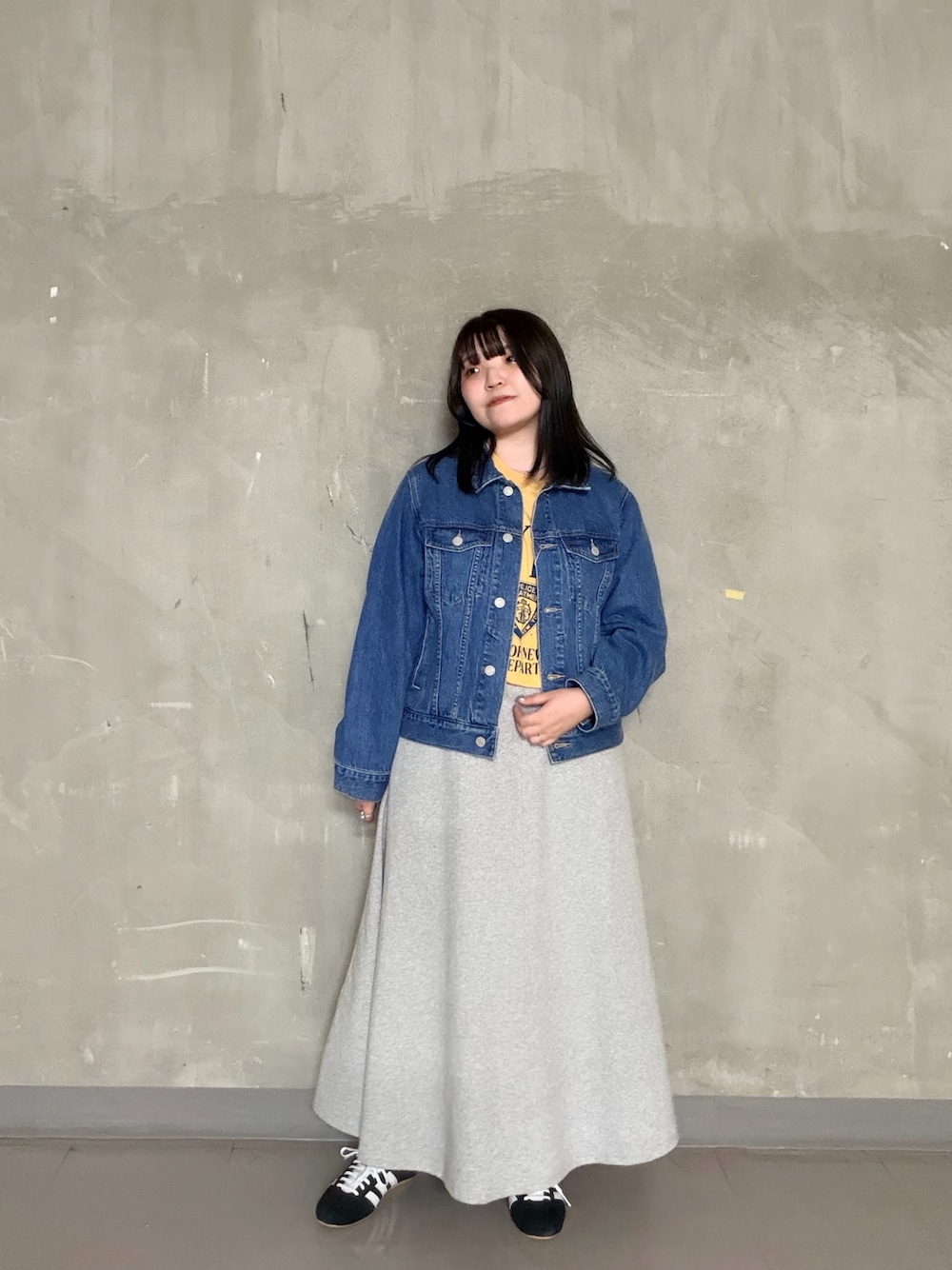 デニムジャケットにイエローを差し色にしてコーデを組みました🫶🏻 春はデニムが着たくなりますね🫧 スウェット地のスカートはウエストゴムで居心地抜群です❕