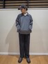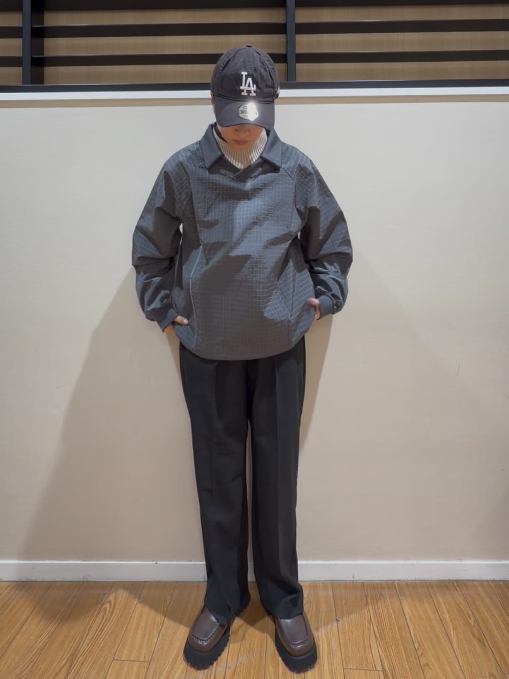グレーのアウターを主役に、ワイドパンツとローファーで落ち着いた雰囲気にまとめたコーディネート。インナーにタートルネックを合わせることで首元にアクセントをつけ、キャップを取り入れてカジュアルさとのバランスを意識しました。