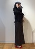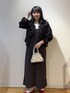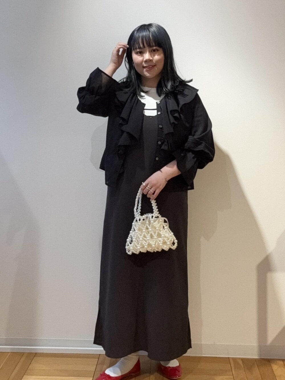 コンフィーシャツシリーズのフリルブラウスを使ったモードめなコーデです。 パールバッグとレッドのバレエシューズで大人可愛い雰囲気にまとめました。