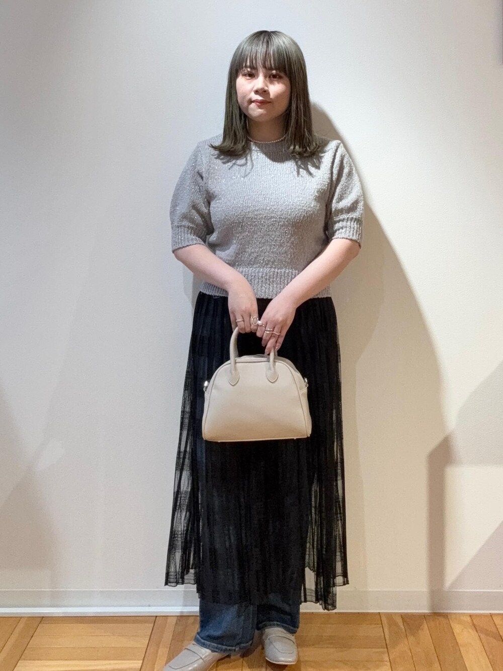 きらきらで1枚で可愛い半袖ニットを使ったきれいめカジュアルコーデです。