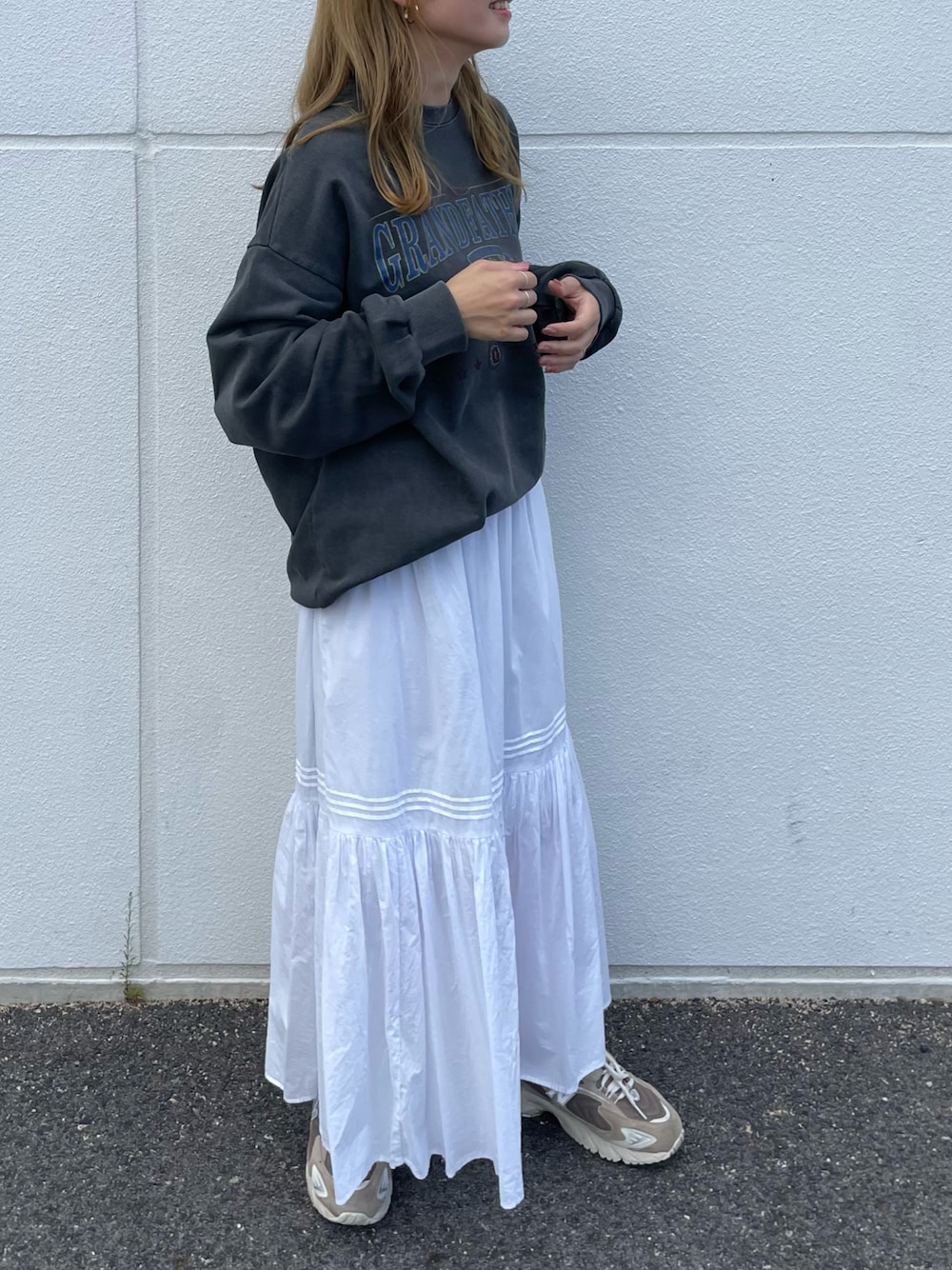 オーバーサイズのスウェットと ホワイトスカート×スニーカーで ミックスコーデ