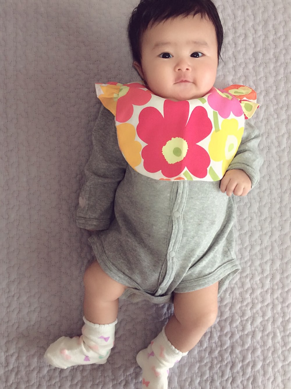 妊娠中にハンドメイドしたマリメッコのスタイ、ようやくデビュー☺️🌺 今日も晴天‼︎どこにおでかけしようか😊🍀