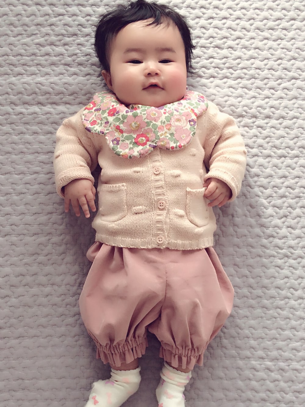 全身ピンクが許されるなんて、赤ちゃんだけ👶💕💕 ピンクばかり着せたくなります😉🍒 ハンドメイドの花びらスタイとかぼちゃパンツを着るとピエロのようになりました🙃💕