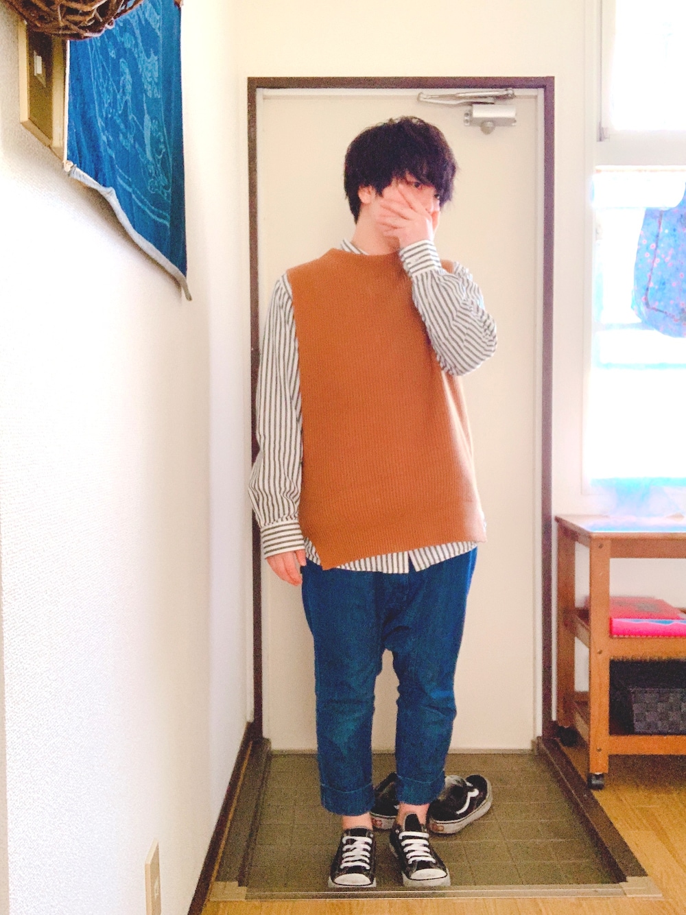 オーバーサイズ の ニットベストをきたらぴったしやんって笑 ニットベスト自体は古着屋で買って330円🙆♂️ 友達とマスカレードホテル見に行きました👍