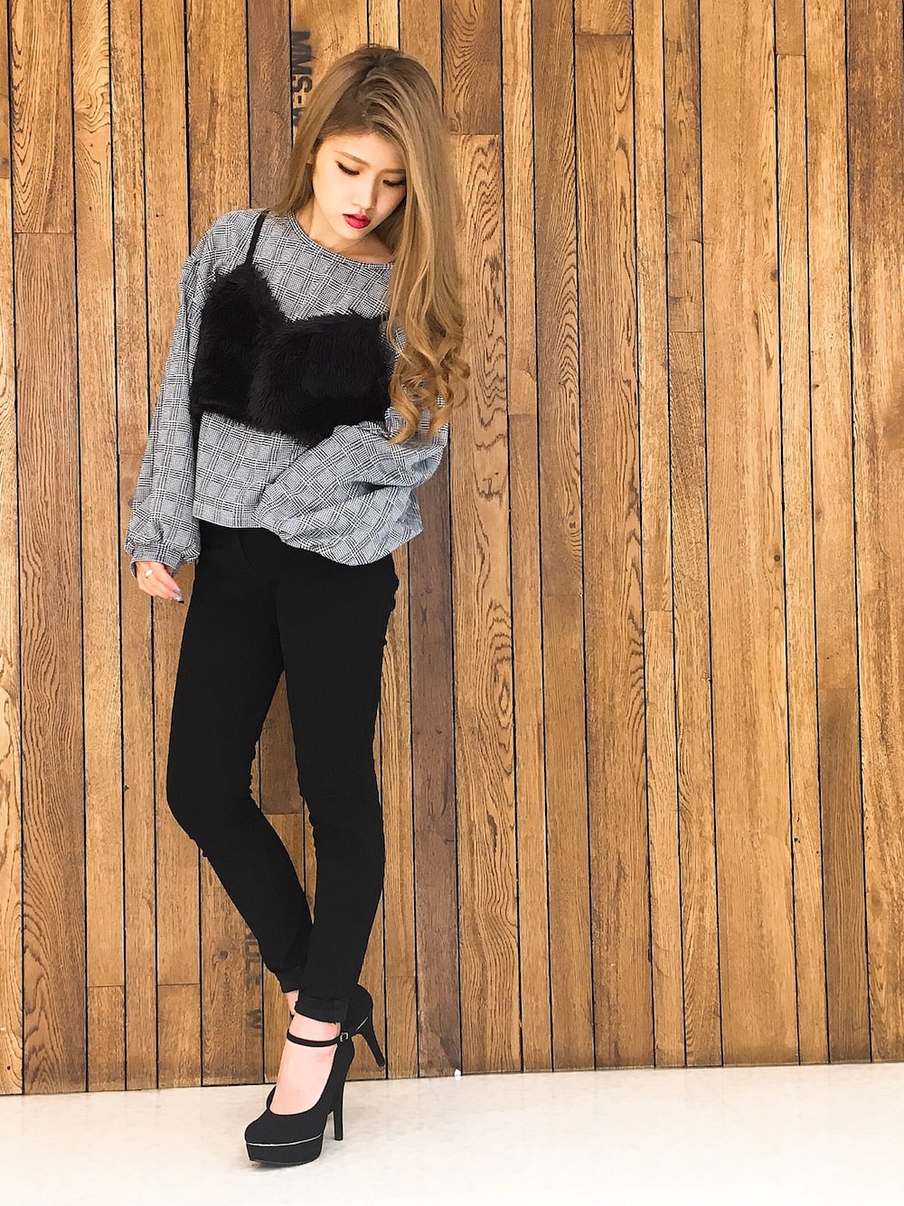 グレンチェックのトップスはバルーンスリーブが可愛い💕 パンプスはメッキのラインがアクセントになります😘