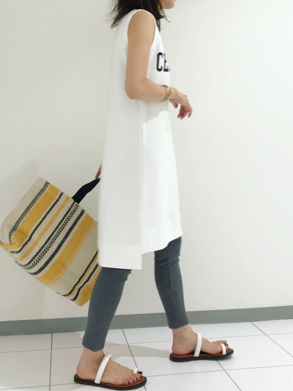 ホワイト系のワンピース、グレー系のレギンス/スパッツを着用したレディースの夏コーディネートの1枚目の写真