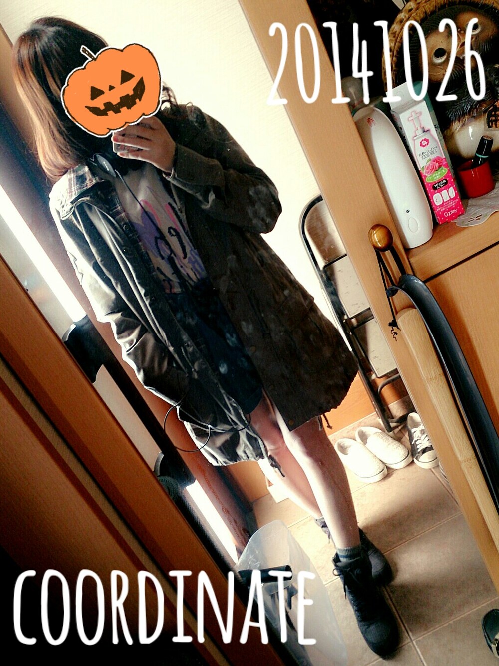モッズコート チェックシャツ バンドTシャツ ハイウエストショートパンツ インヒールスニーカー