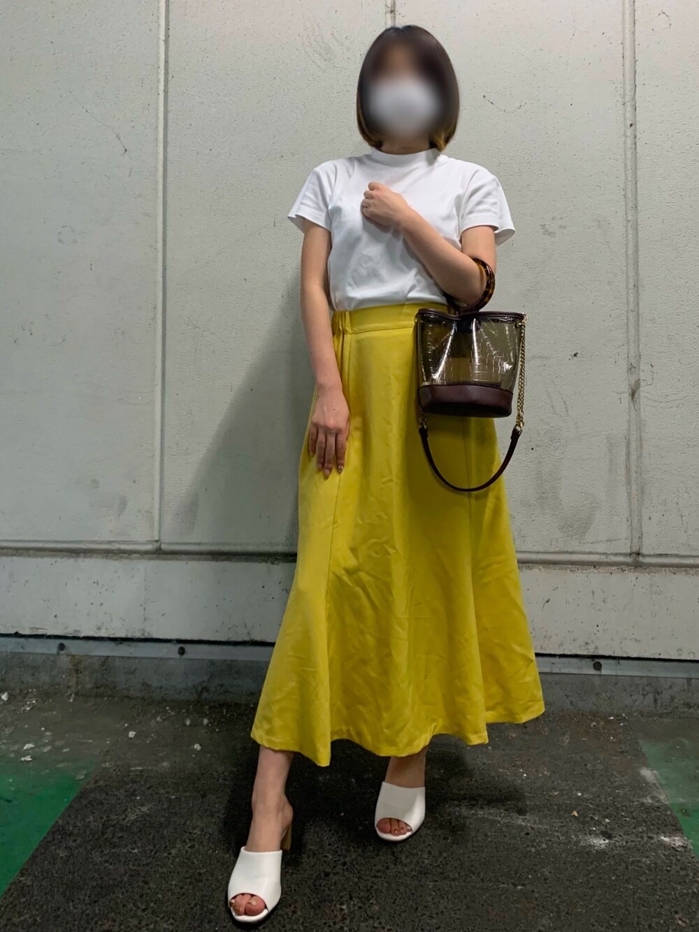 イエロー系のスカート、ホワイト系のサンダルを着用したレディースの夏コーディネートの1枚目の写真