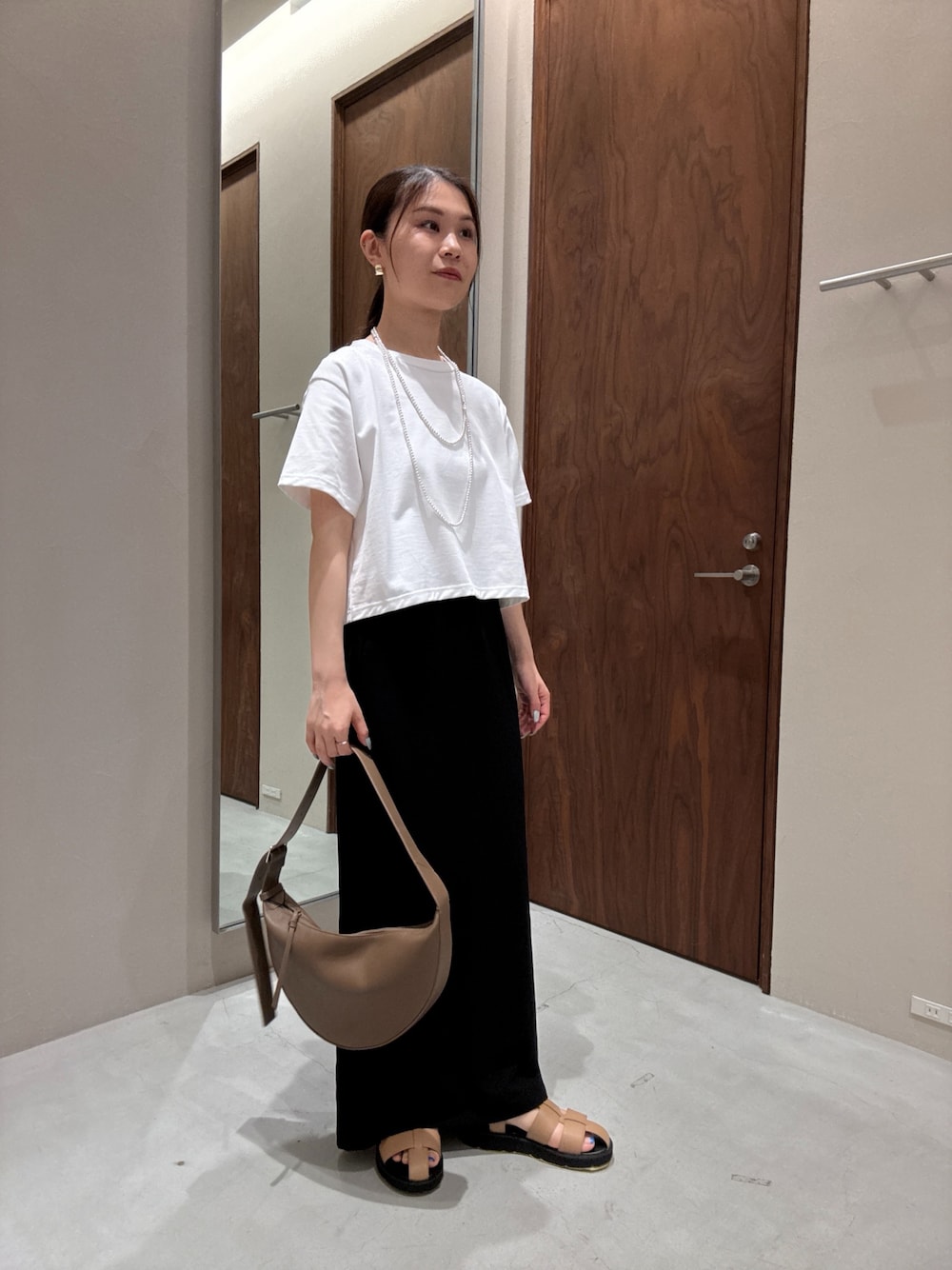 クロップド丈のTシャツで今っぽく スカートはジャージー素材で、ウエストもゴムなのでサラサラ涼しく楽チンな1着