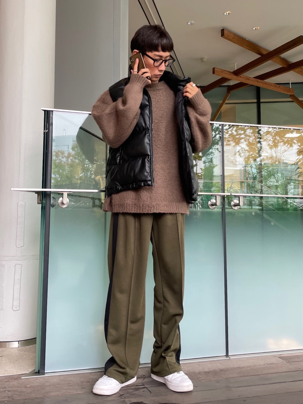 🟤🟢 BROWN×KAHKI 🟢🟤 全体をアースカラーでまとめたスタイリング🍃 中綿ベストはレディースアイテムですが メンズでも着られるサイズ感◎!! ブラウンのモヘアライクニットは ZOZOにてタイムセール中!!!