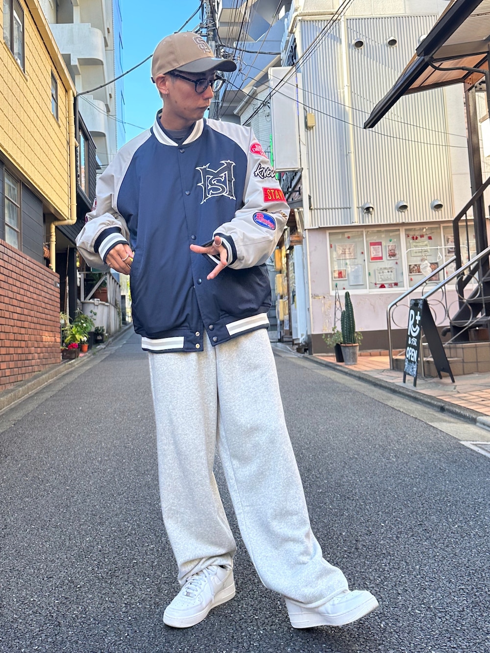 🔵⚪️ NAVY×GREY ⚪️🔵 スタジャンは閉じても着られる万能アウター! スウェットパンツとあわせてリラックススタイルに😉