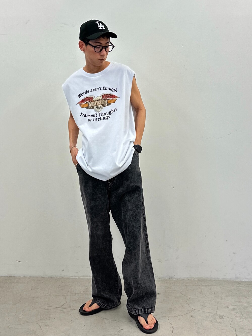 ⚪️⚫️ WHITE × BLACK ⚫️⚪️ 今年の夏はノースリーブTがおすすめです!!! 加工感のあるプリントはキャップなどのアイテムと相性◎です!