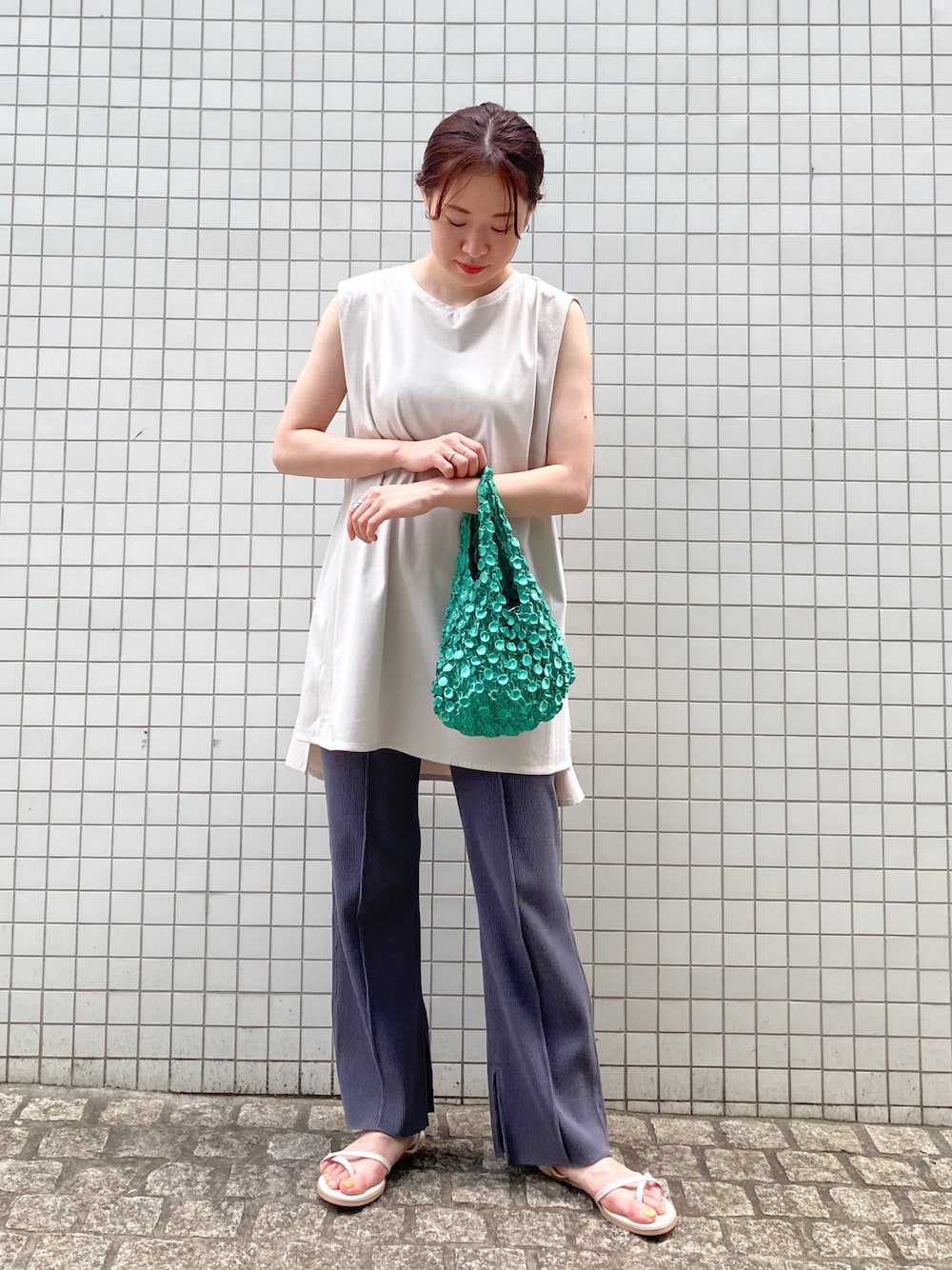 シンプルなカラーのコーデに、 グリーンのエコバッグをアクセントに。