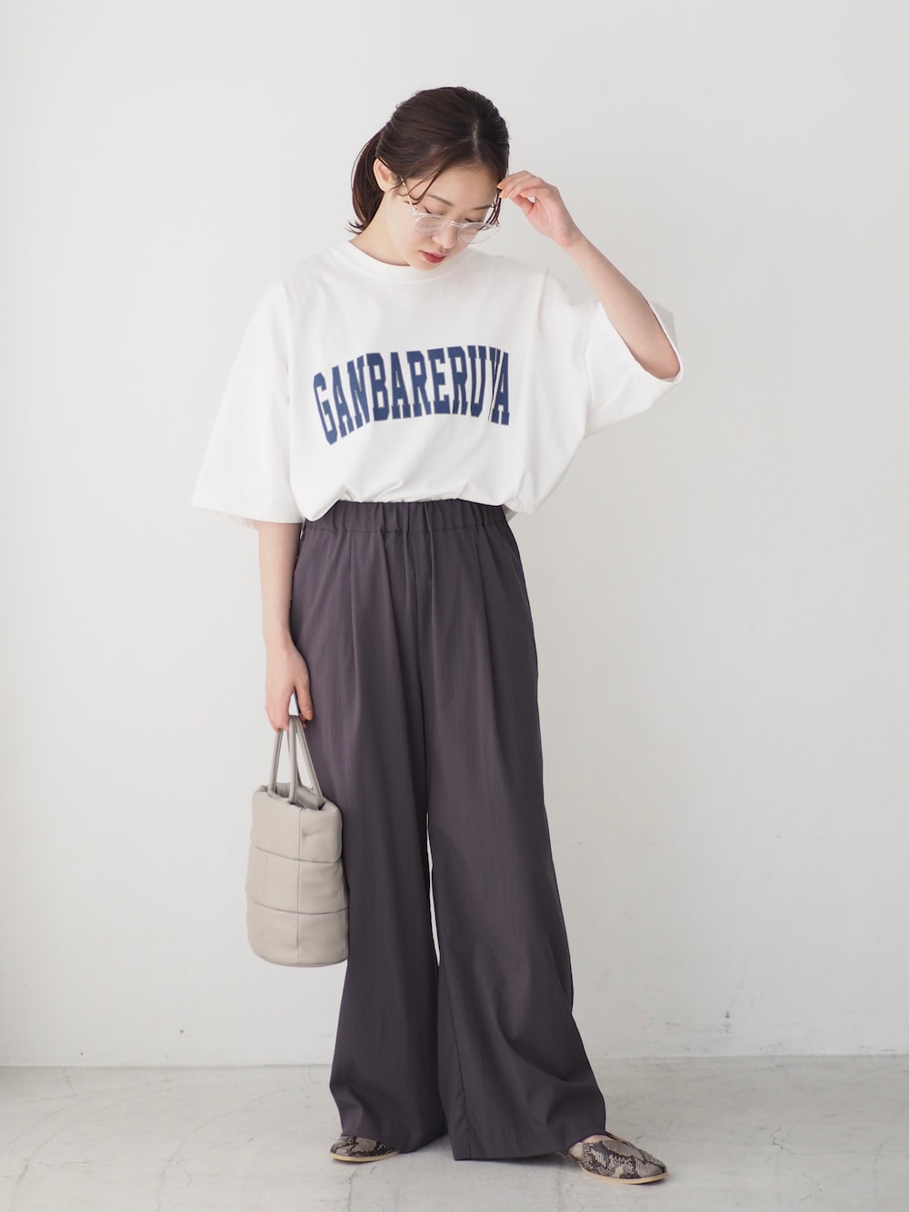 ガンバレルーヤさんとのコラボTシャツで、トレンド感のあるスタイリングに。 インしたことで、トップがコンパクトに見えるのでスタイルアップが目指せます。