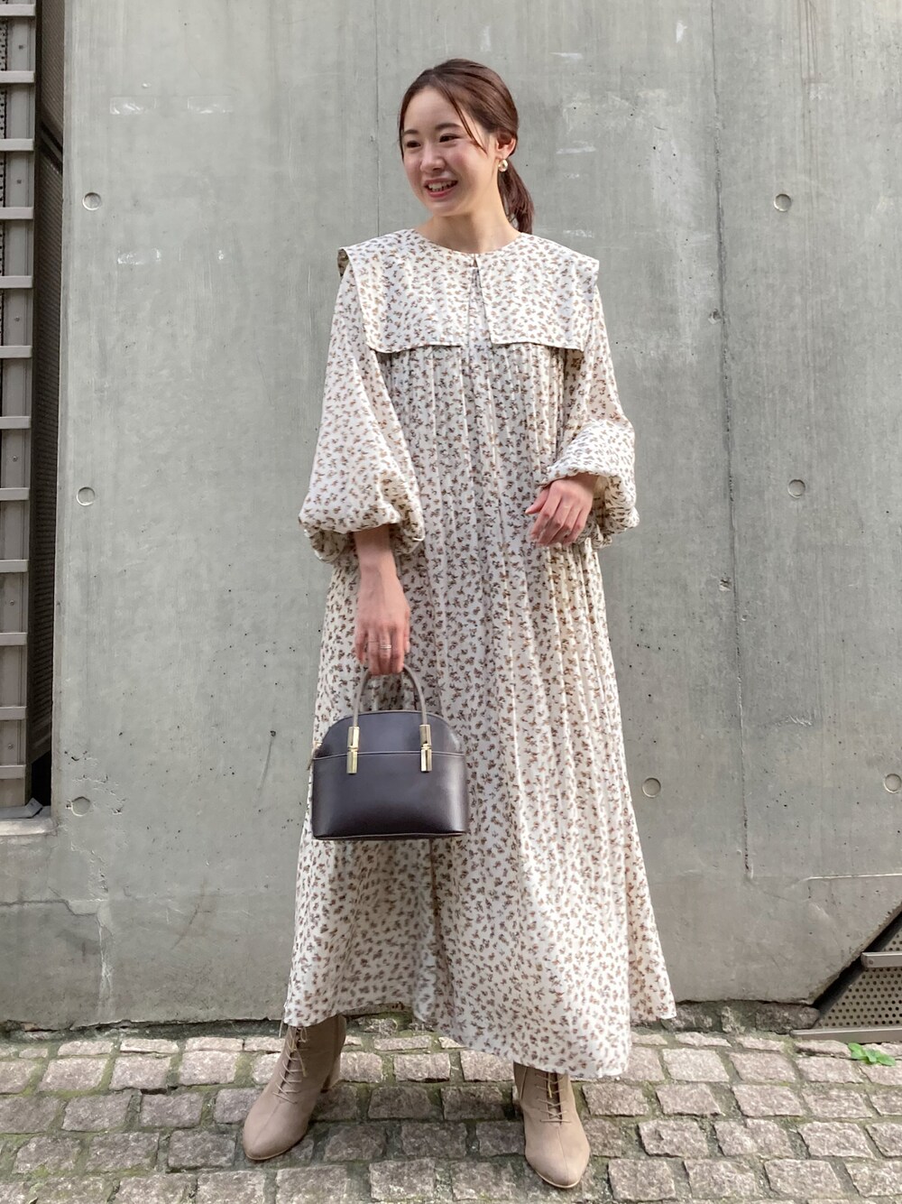 近藤千尋さんとのコラボワンピです! 小花柄とボリューム感が女性らしいワンピースです。 襟は取り外しができるので、シーンに合わせて付けられるのも◎ レースアップブーツでフェミニンに仕上げました♪
