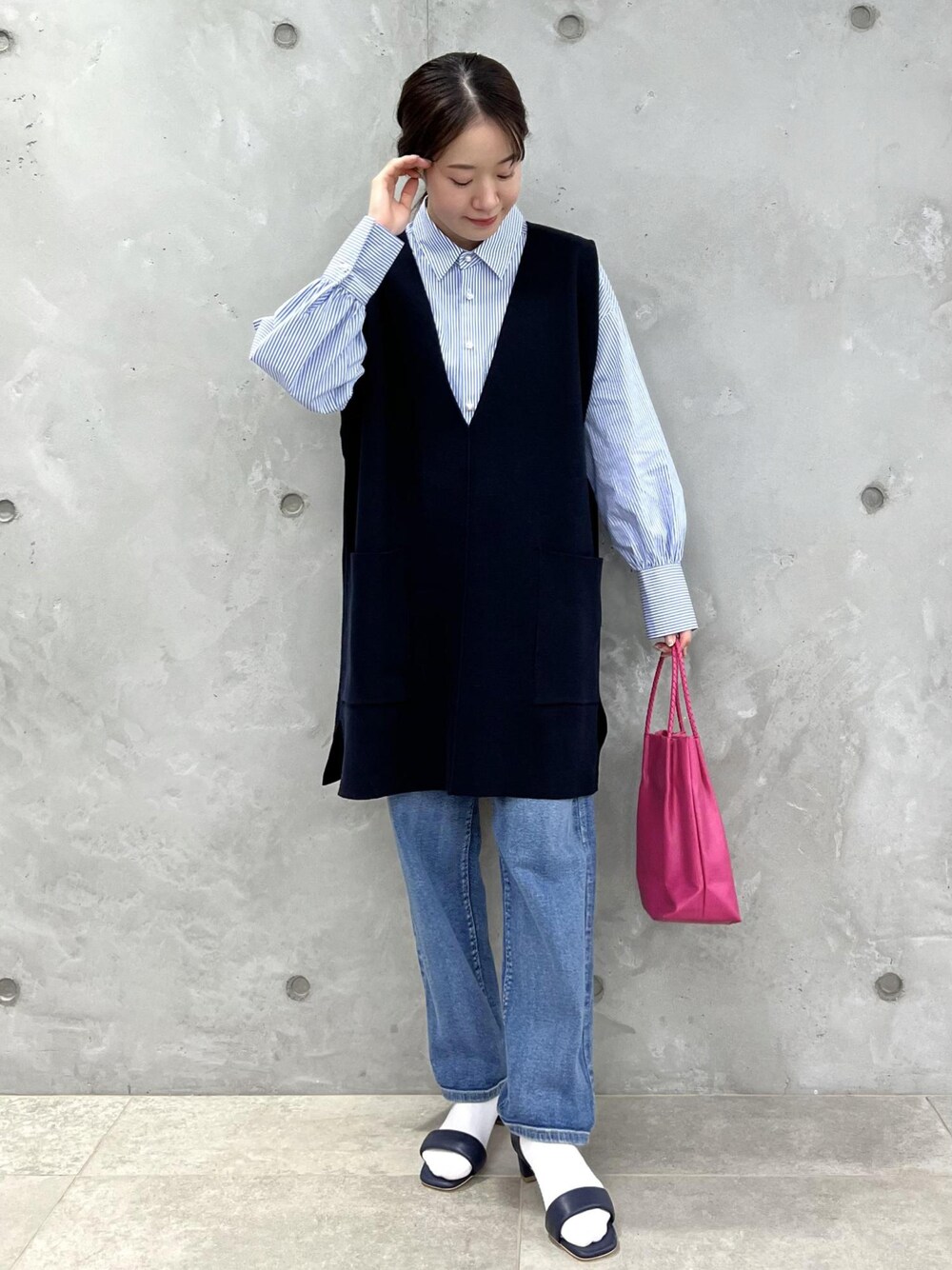ニットベストとシャツで春コーデに! ピンクのバッグでカラー×カラーコーデにしたのがポイントです♪