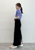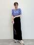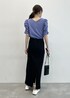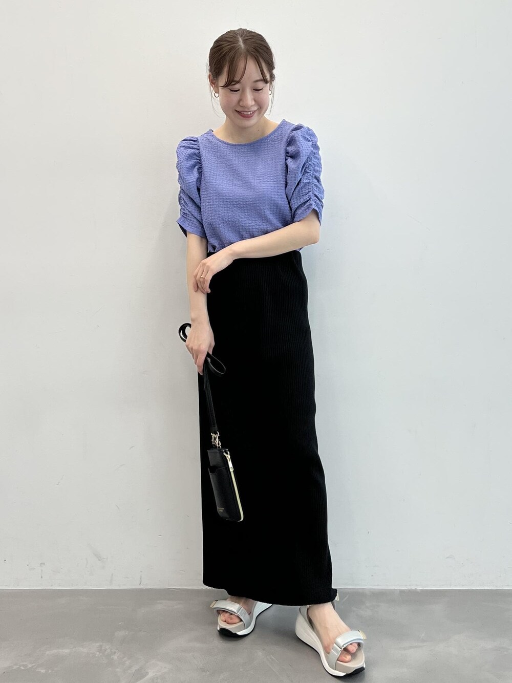 パフスリーブのトップスで可愛らしく、アイラインスカートで大人っぽくしたコーディネートです。 ウェッジソールのサンダルはテイスト問わず合う、優れシューズです。