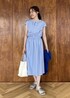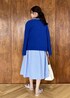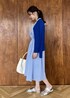 ブルーのワンピにブルーのガーディアンを合わせて、上品なコーディネートに。 すっきりしたシルエットのガーディアンで、バランスよくなるようスタイリングしました。