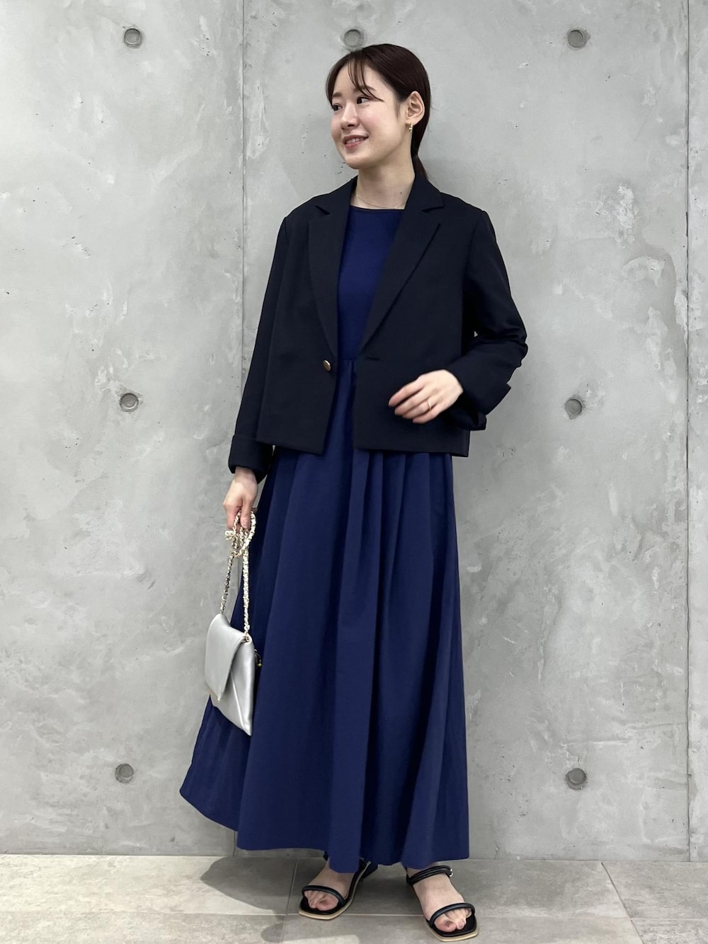 ワンピースに短丈ジャケットを合わせてスタイルアップコーデに。 小物次第でお仕事からディナーまで着ていけるコーディネートです!