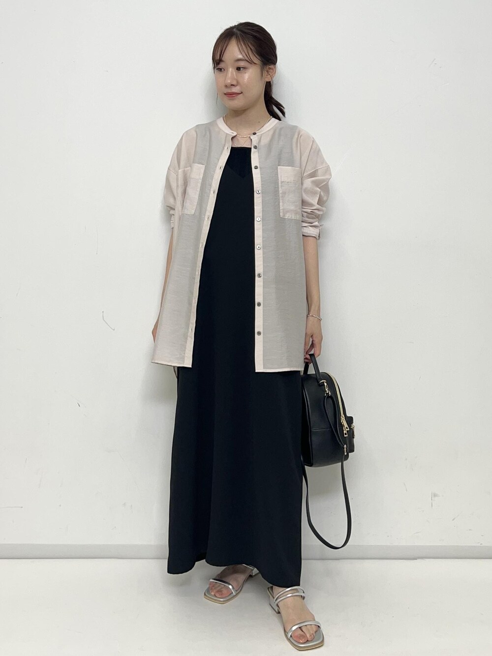 キャミワンピにシャツを羽織って肌見せを抑えました。 小ぶりのリュックで可愛らしい印象に。