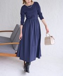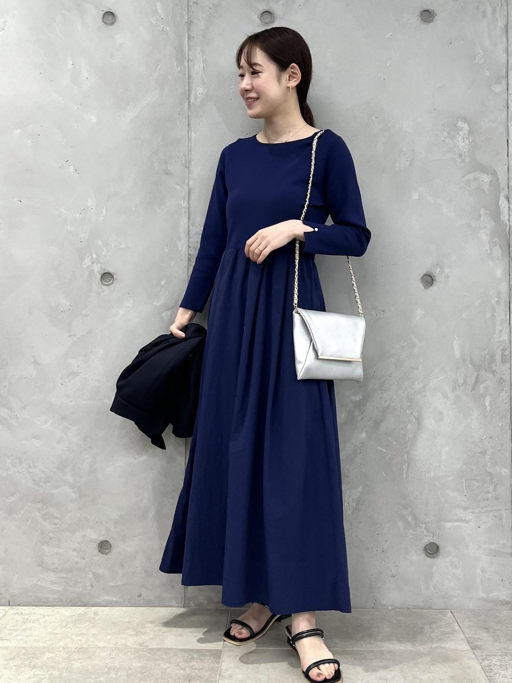 ワンピースにきれいめアイテムを合わせてお出かけコーデに。 ニットと布帛のドッキングワンピースなので、丁度よいラフさが出ます。