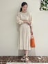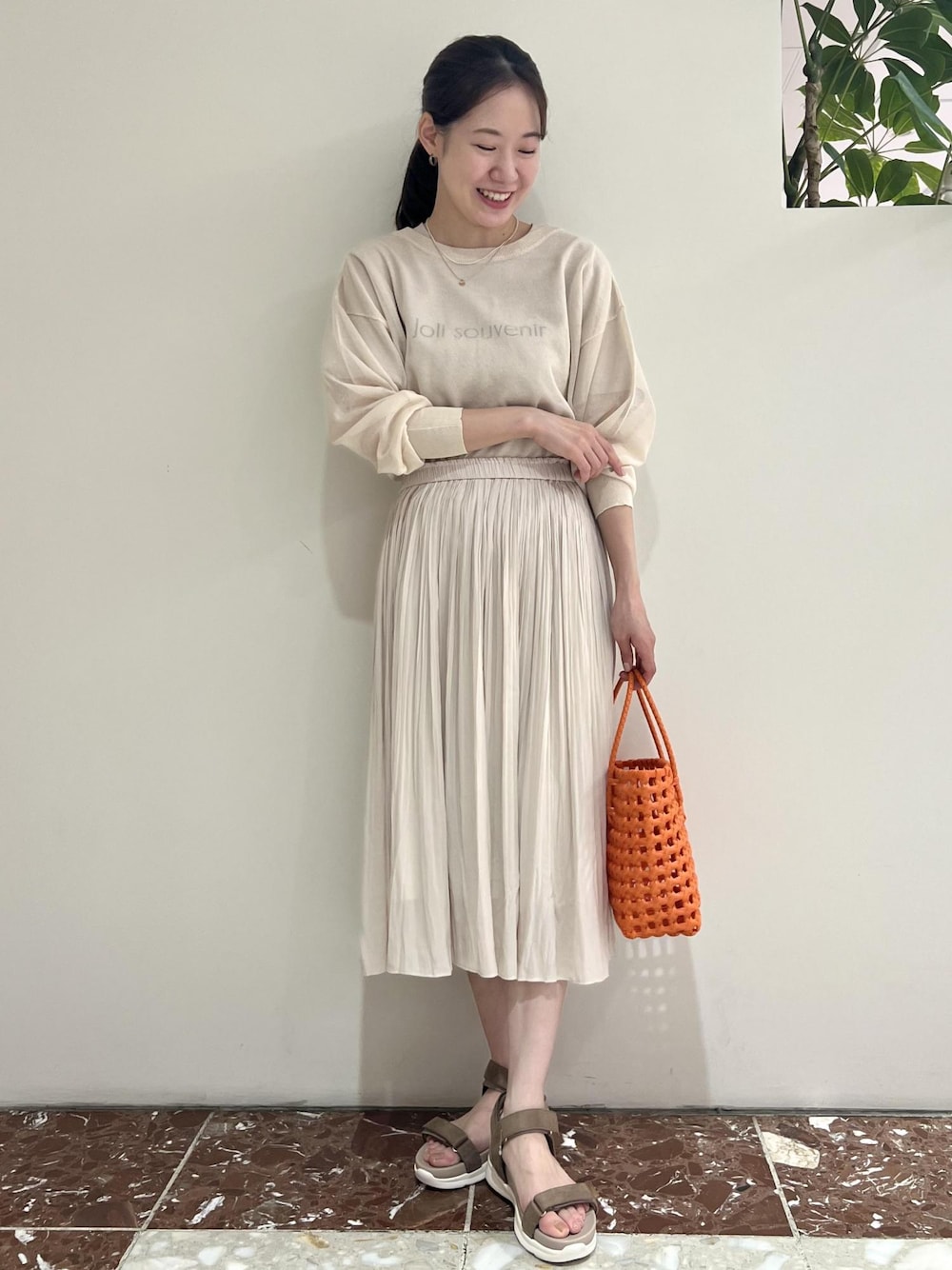 ベージュのスカートと、Tシャツカーディガンをレイヤードしてみました。 カーディガンをバッグボタンにして、シアートップスとしてきたのがポイントです!