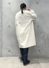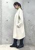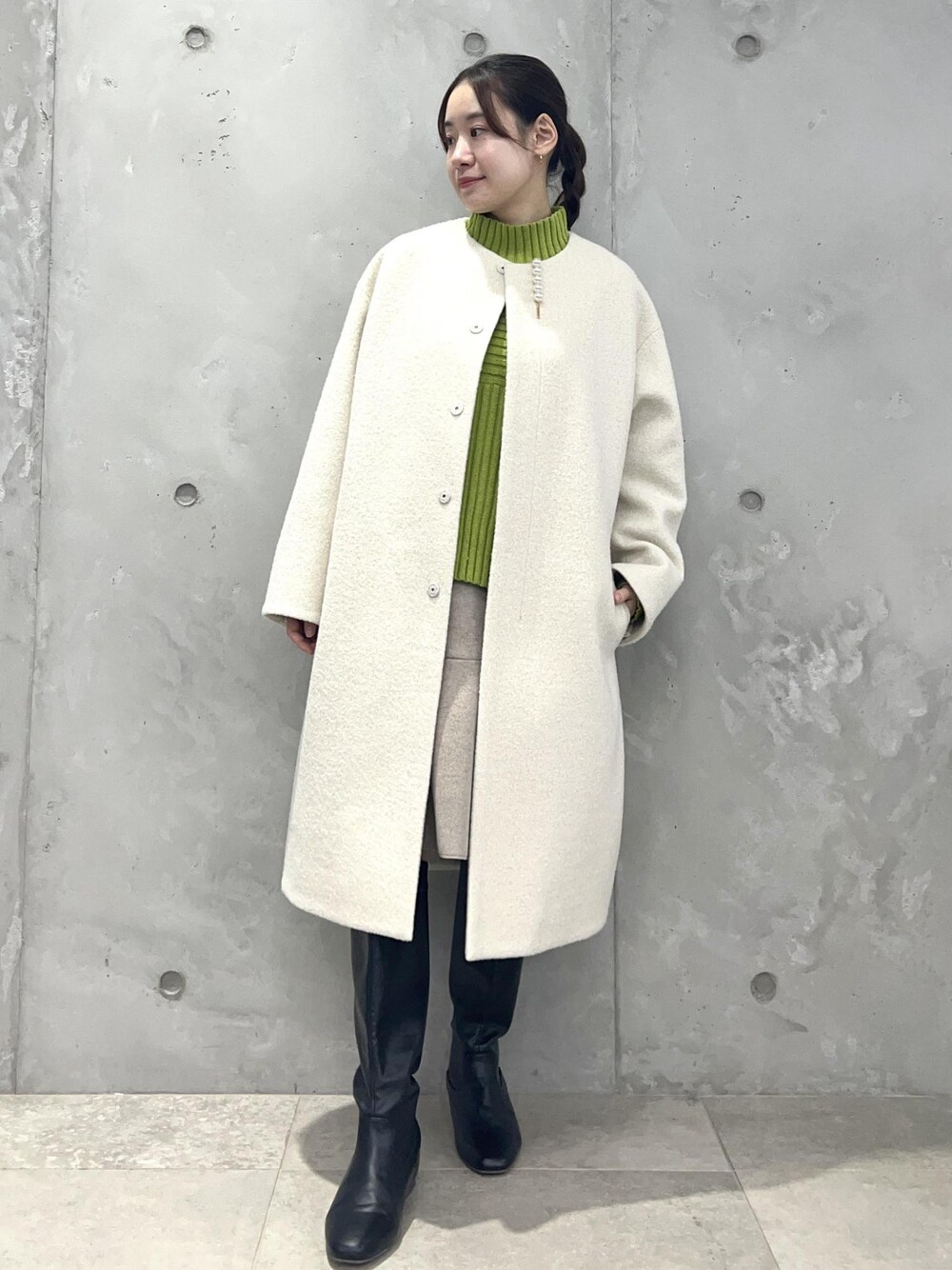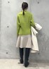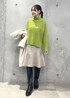 パールピン付きのコートで、ミニスカートをきめいめコーデにしました。 カラーニットで華やかさもアップします。