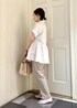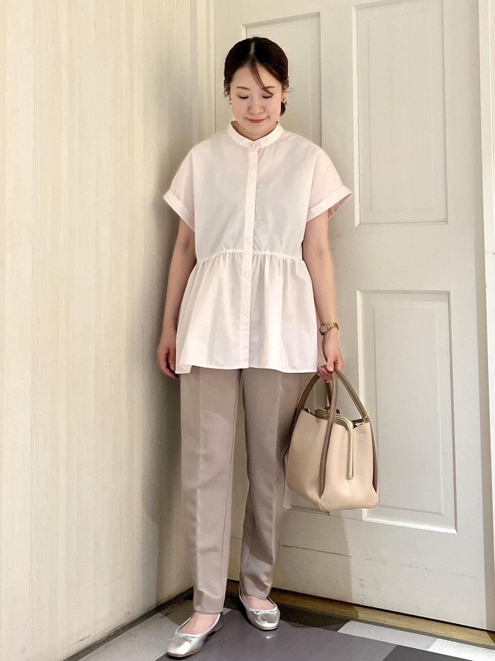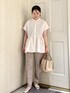 ペプラムブラウスにテーパードパンツを合わせたきれいめコーデです。 きちんと見えするパンツなのでピンクのブラウスも上品に仕上がります。