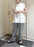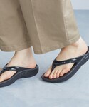 シャツにワイドパンツで、シックな印象に。 そこにOOFOSのOOlalaを合わせてカジュアルダウンさせました。OOlalaはツヤのあるトングがきれいめスタイルにもマッチします。