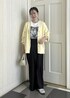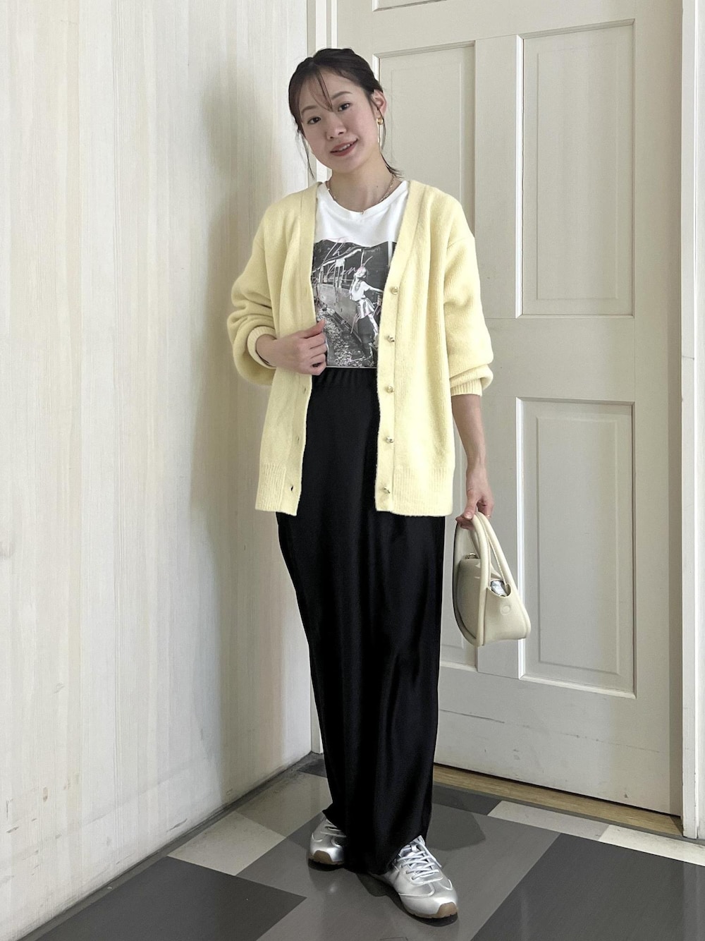 ゆったりめのカーディガンを、フォトTシャツとスニーカーでカジュアルに。 ラフになりすぎないよう、シルバーのスニーカーをワンポイントにしてみました!