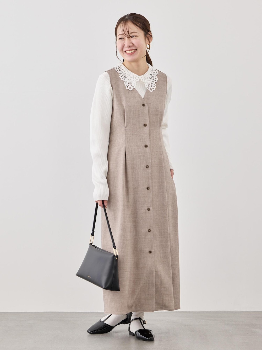 きれいめなジャンスカにレース襟のトップスで可愛らしくアレンジ! 小柄さん向けのジャンスカなので、ジャストサイズで着られました。