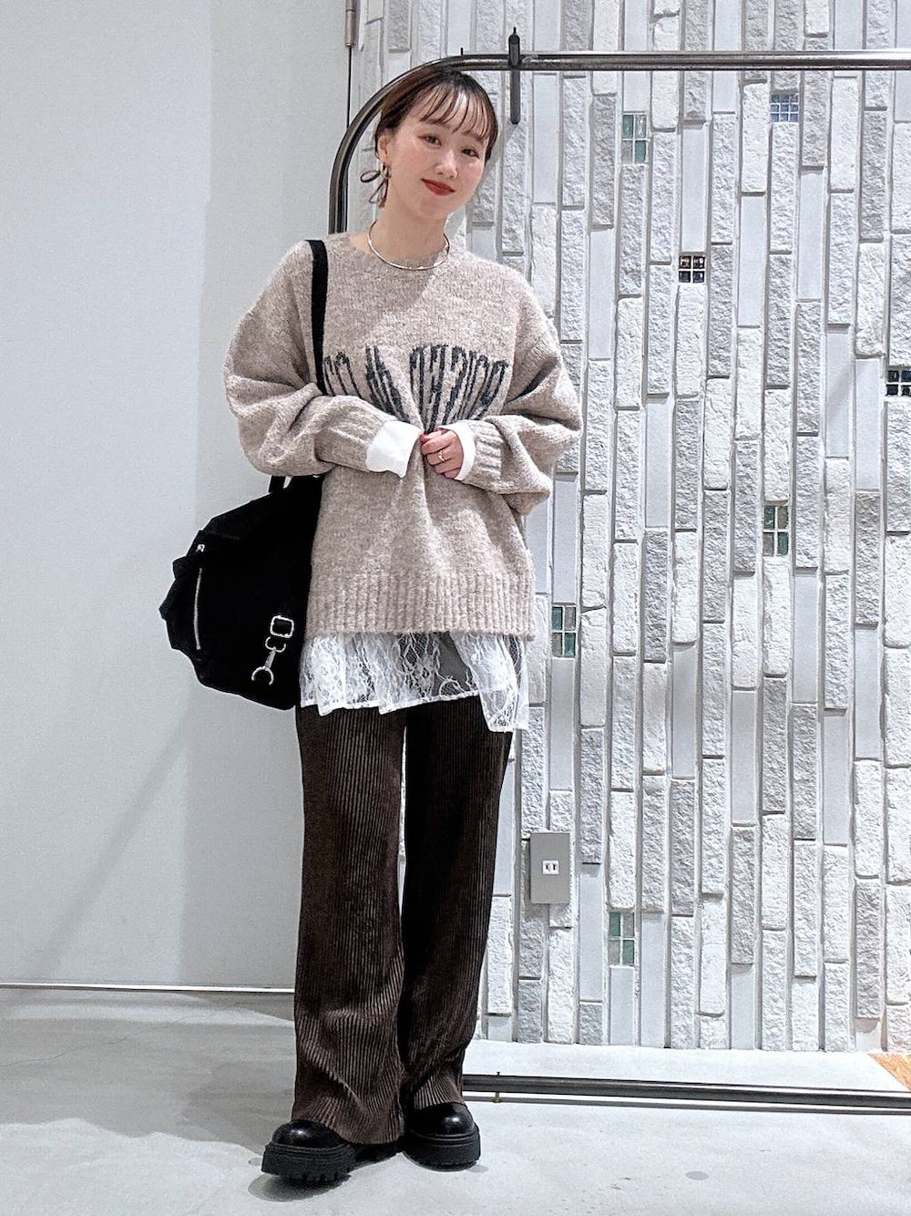 レースをワンポイントにカジュアルコーデ♡ インナーとバック以外SALEになってます✨ ◉inner ★F(着丈66)★FT(着丈79) Fを着用しております✨ ニットやスウェット、ジャケットなど、 様々アイテムにレイヤードするだけで オシャレ見えするので、1枚は持っておきたい アイテムです! ◉tops 毛足が長めのロゴニット🧶♡ 体のラインを拾いにくいゆったりした サイズ感ですが、ニットにボリュームがないので めちゃくちゃスッキリ見えました☺️ 中にシャツやロンTをレイヤードするのも おすすめです✌️ ◉bottoms ベロア素材のプリーツパンツです✨ 少し光沢があるので、きれいめが お好きな方にもおすすめです💕 セルフカット可能なのでお好みの丈感で 穿けるのが嬉しい☺️ ◉shoes ヒール高さ5cmでシンプルなので 長く履けるサイドゴアブーツ🥾♡ 滑りにくい裏底の工夫もされてるので 雨の日も安心してお使い頂けます✨ ボリュームはありますが軽量なので、 長時間のおでかけの際にもおすすめです! 最後まで読んで頂きありがとうございます😊 是非ご参考になれば嬉しいです💕