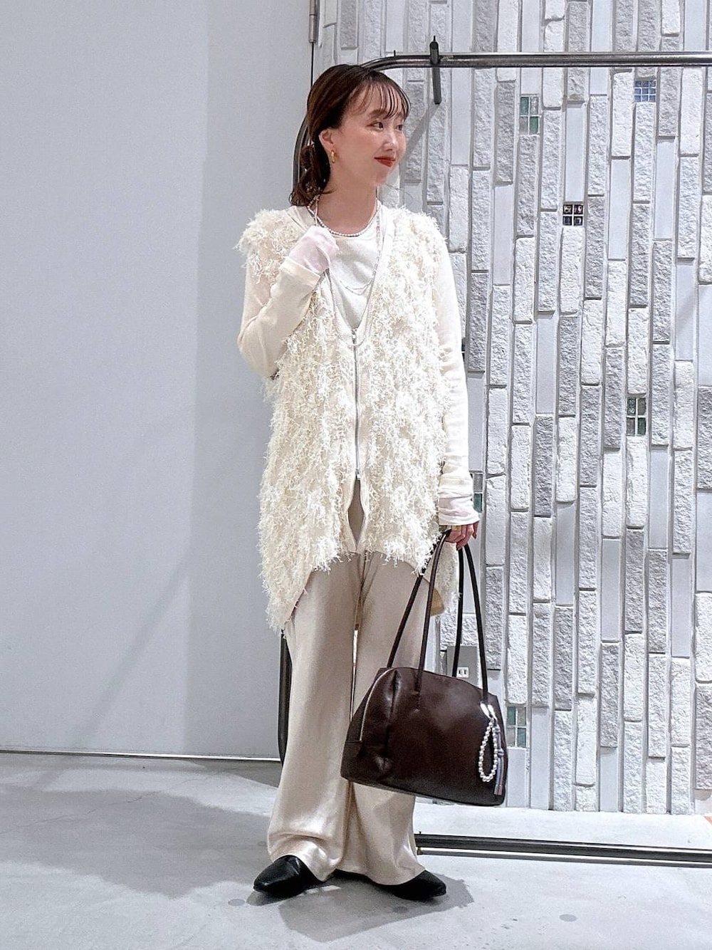 ホワイトのワントーンコーデ🤍🤍 ◉vest フリンジ素材がかわいいWZIPの チュニックベスト☺️ 後ろ下がりなデザインなので 体型カバーも叶う1枚✨ ロンTなどでカジュアルに合わせるのも おすすめです! ◉bottoms かなり細見えするサテンパンツ✨ 153cmで少し長かったので、 ウエストで1回折るとちょうど良かったです! 股上は深めなのでお腹も楽ちん💕 広がりすぎてないシルエットが◎ ◉bag お荷物がしっかり入る大きさのボストンバッグ👜 軽くて持ち手が長めになってるので 肩掛けもしやすいです✨ 少しマットな質感なので高見え上品な スタイリングにもマッチします◎ ◉shoes 履いたらびっくりするくらいのクッションが ふかふかなUカットパンプス🥿♡ 約1cmのヒールがあるのでぺたんこすぎず 履けるのが嬉しい☺️ 生地感も柔らかいので普段にもお仕事にも とてもおすすめです!