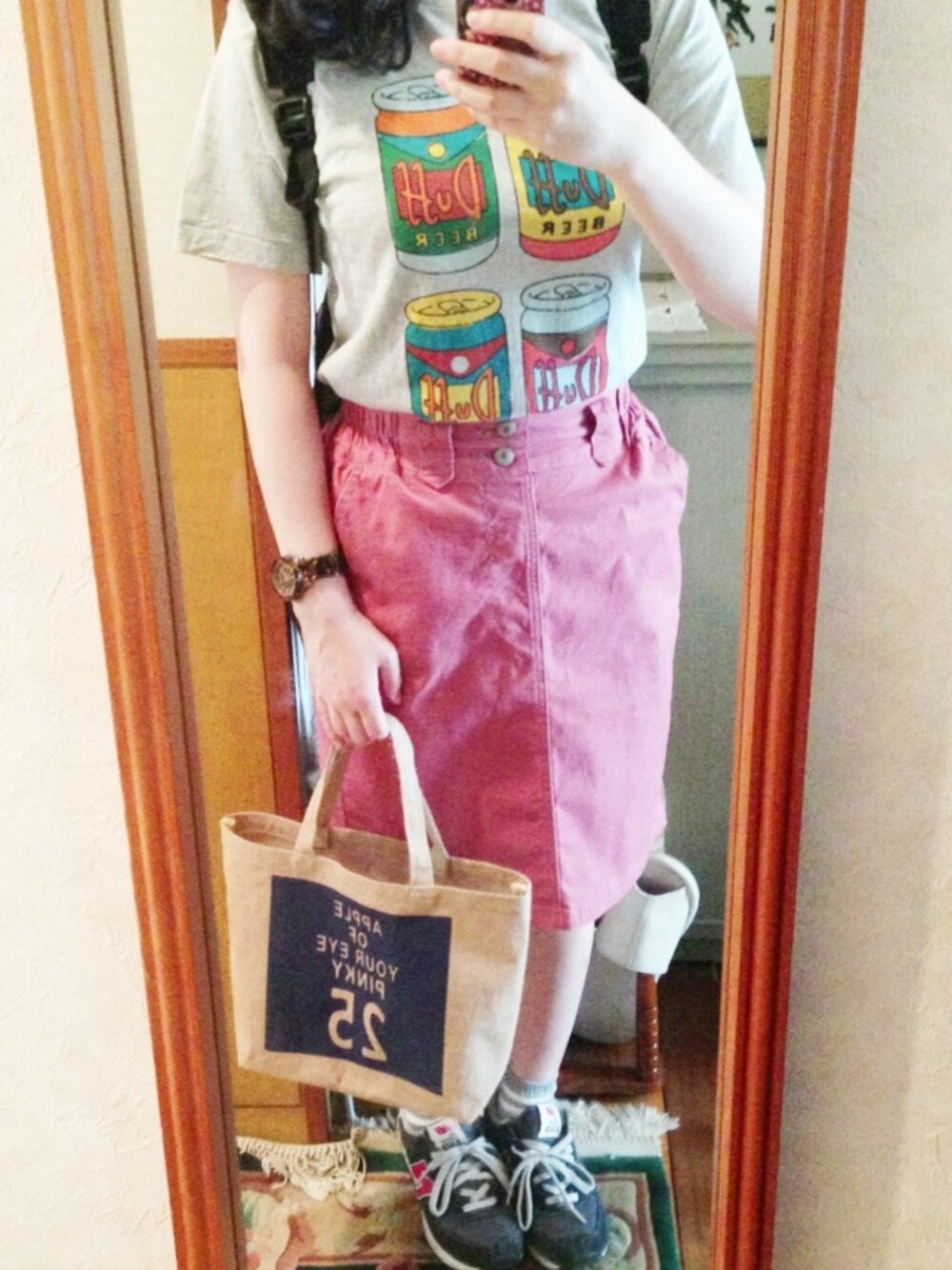 Tシャツ: UNIQLO スカート: a.g.plus バック: AS KNOW AS PINKY UT着心地よくて安くて最高(^∇^) 学校がんばる〜