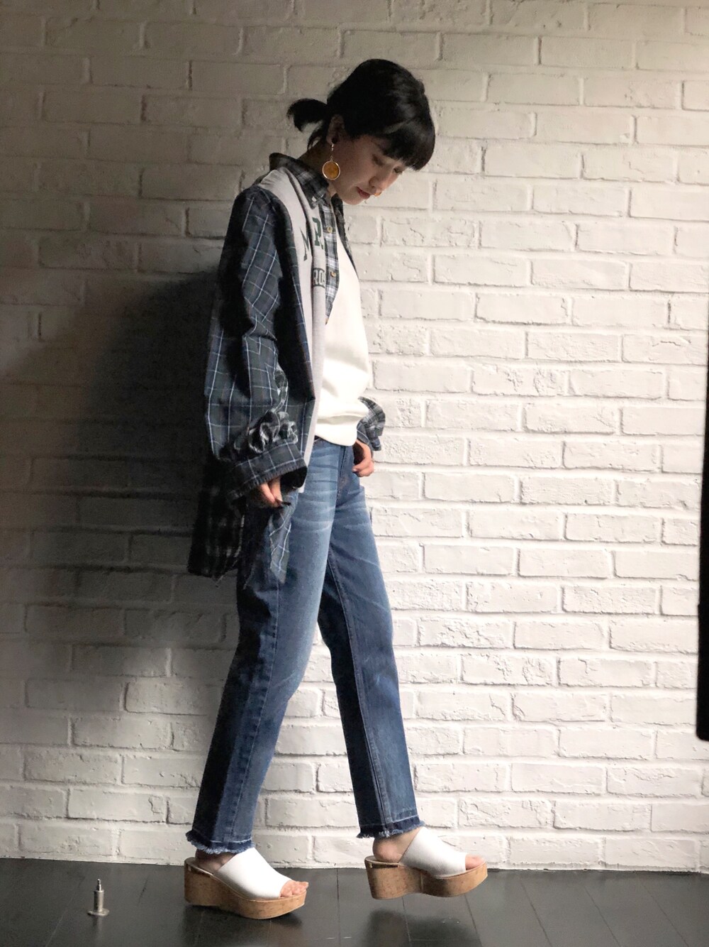 77circaとの別注シャツは、変形シルエットが可愛い一枚♡ 一枚でおしゃれに見えるから、他をシンプルにカジュアルスタイルでまとめました!