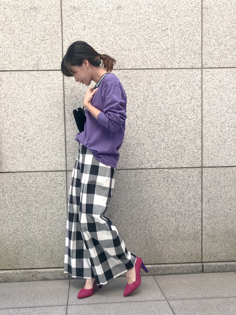 カラーが着たすぎて、Championの別注カットソーのパープルをコーデに取り入れてみました! パンプスは、トップスとリンクしてピンクをチョイス♪ その他をモノトーンで合わせる事で、大人ストリートにまとめました♡