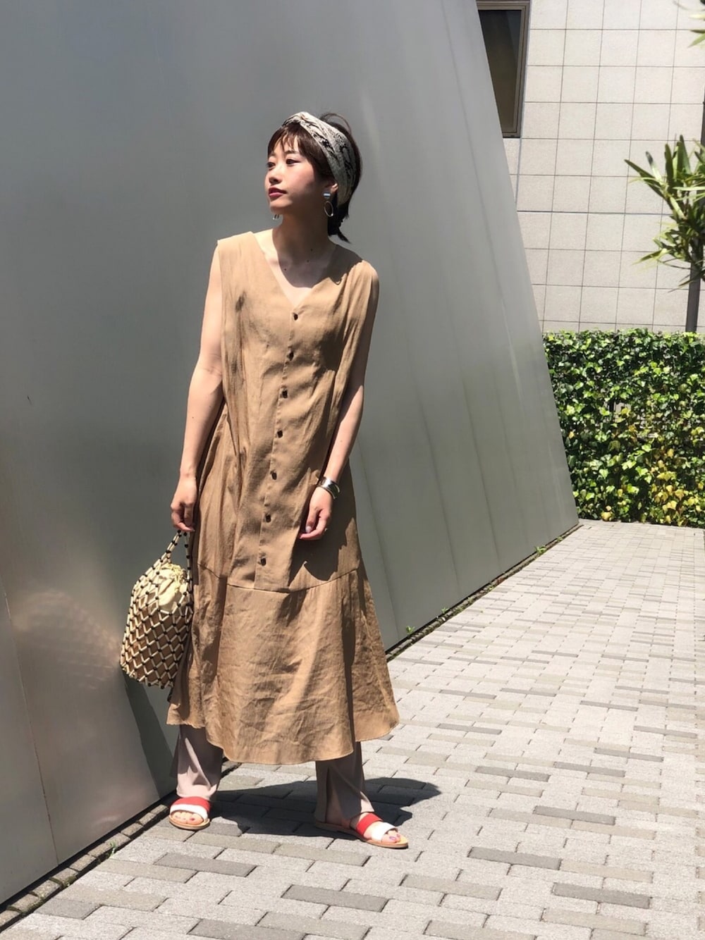 2wayワンピースの着まわし! ベージュをフロントにする時は、スリットパンツとのレイヤードで今年らしいアースカラーコーデにしました♪ ペタンコサンダルや、ビーズバッグで夏らしさをプラス。