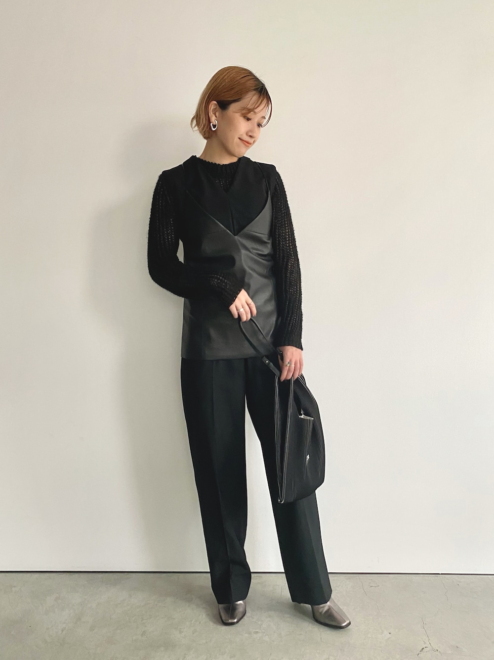 異素材のブラックでまとめたワントーンスタイル! レザー×ニットはこの秋注目のスタイルです。 ノースリーブのオールインワンもレイヤード次第で秋にも活躍してくれそう!