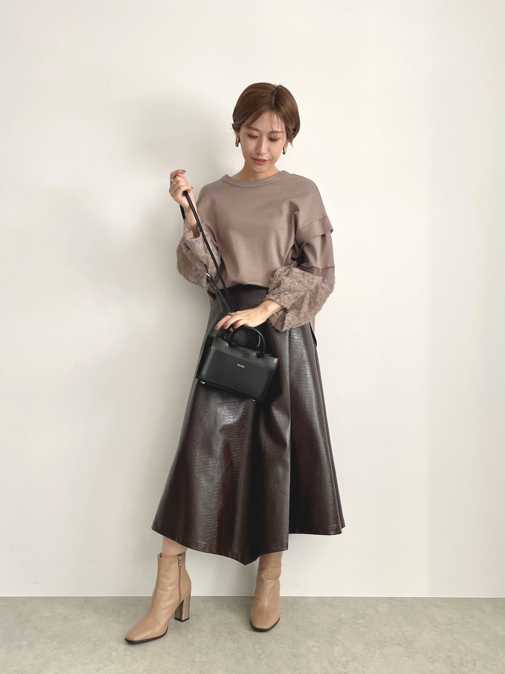 秋カラーのブラウン×ベージュのニュアンスカラーコーデ! ふんわりな袖のカットソーは、トレンドのフェイクレザーのスカートでクールさをプラス!スカートは色味が柔らかいのでレザーがモードすぎず、ほどよくカジュアルにまとまります☺︎