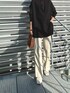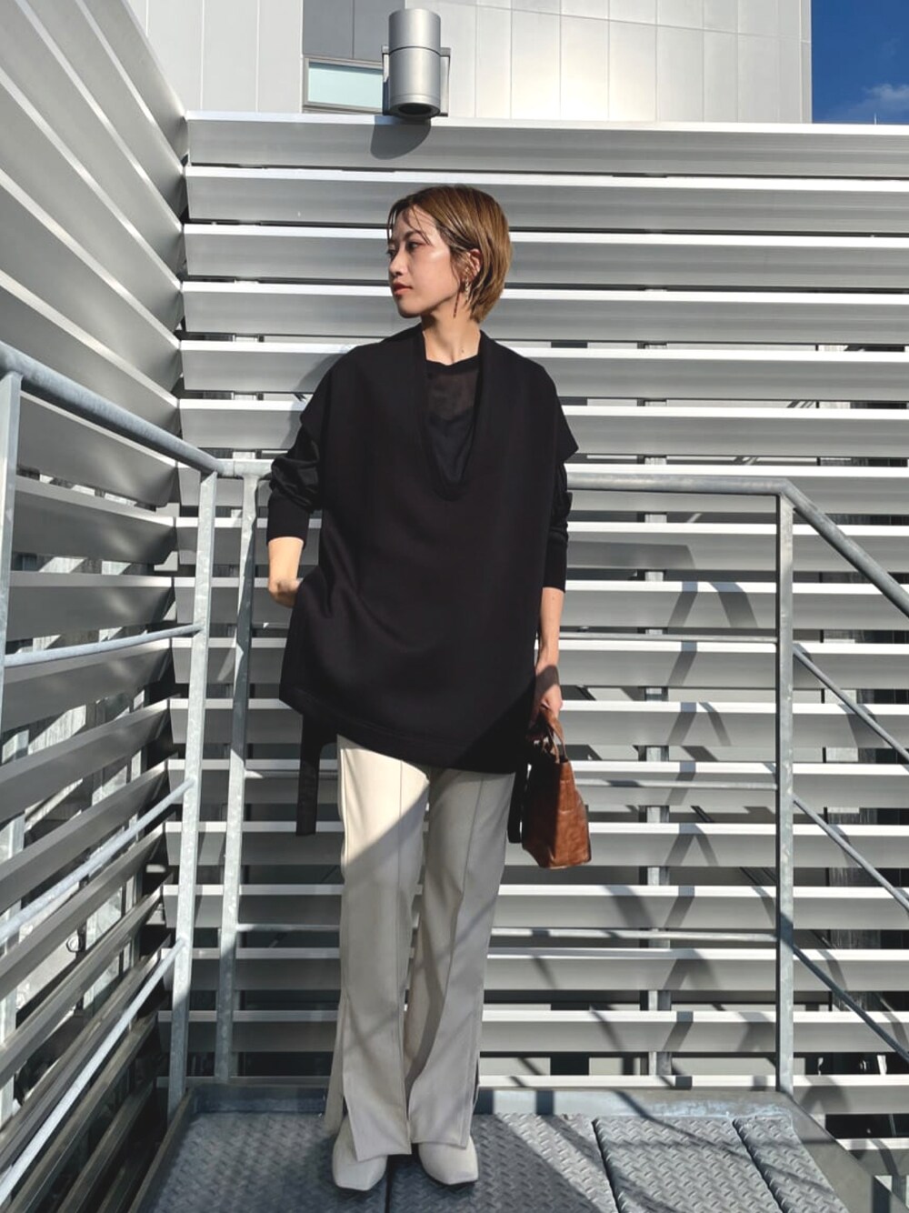 モノトーンコーデは、トレンドのレザーやシアーなど素材感で変化を出すとより今っぽいスタイルに! 深く開いたVネックとウェストベルトがアクセントになったデザインベストは、ゆったりなサイジングなのでレイヤードスタイルには必須の一枚。 パンツとブーツの色を合わせると、より足長効果がアップします!